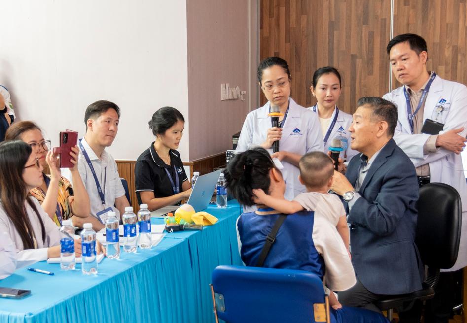 Ảnh 4: Dr Donny Won Suh, Trưởng khoa Nhãn nhi và Lác/Lé, Giám đốc Y khoa Viện Mắt Gavin Herbert, Đại học Irvine, California vừa thăm khám bệnh nhi vừa hội chẩn và hướng dẫn lý thuyết thực hành cho bác sĩ chuyên khoa mắt