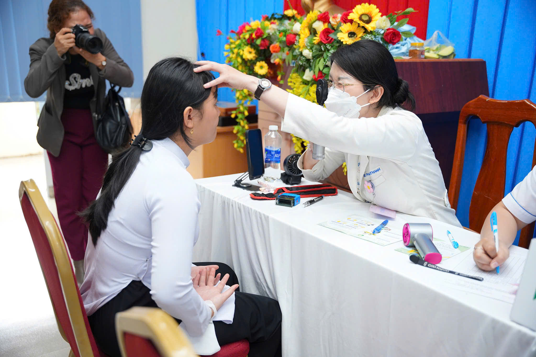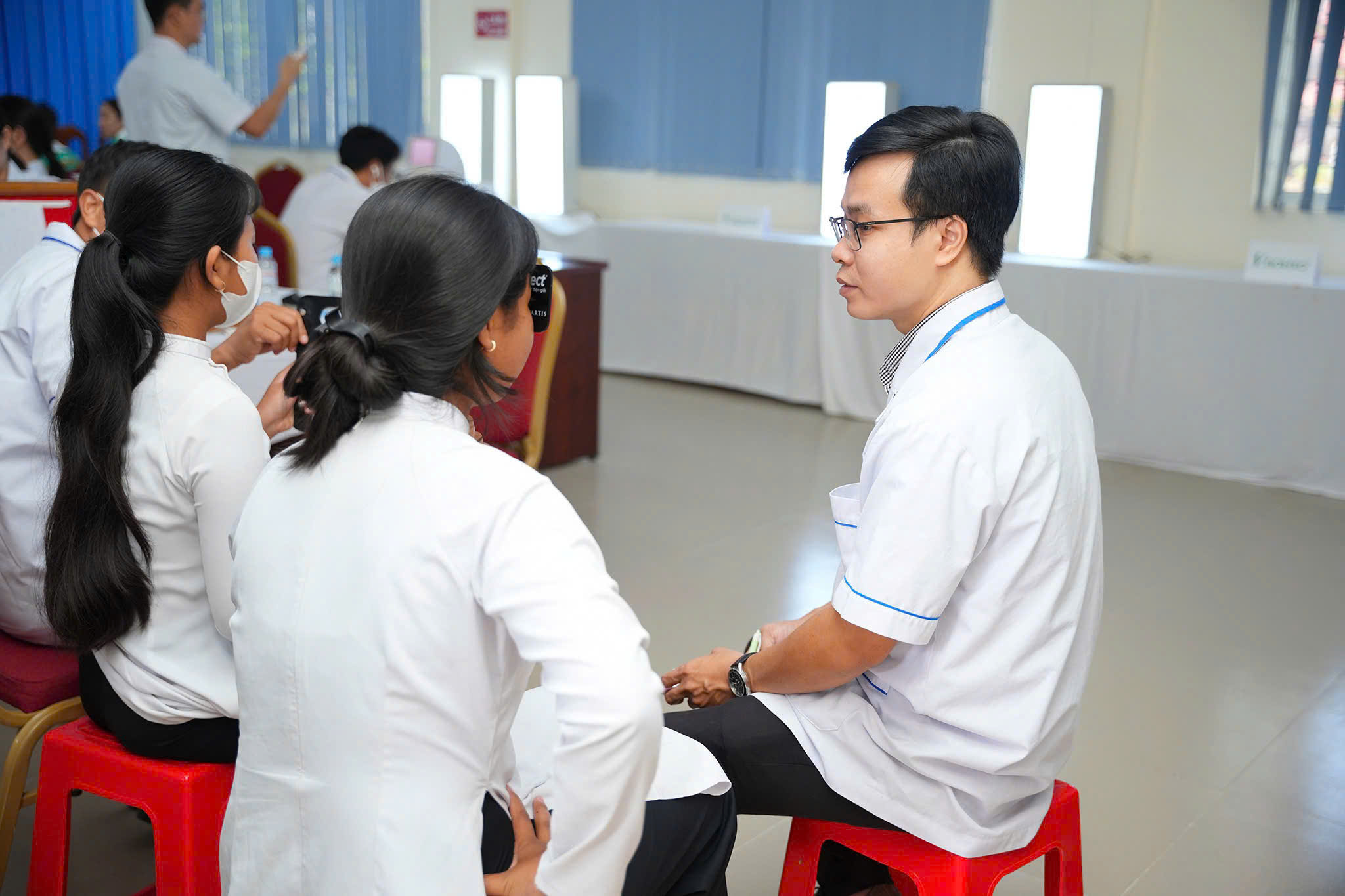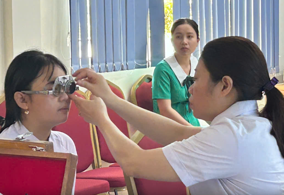 Khám mắt cho học sinh và hướng dẫn bài tập vật lý trị liệu.