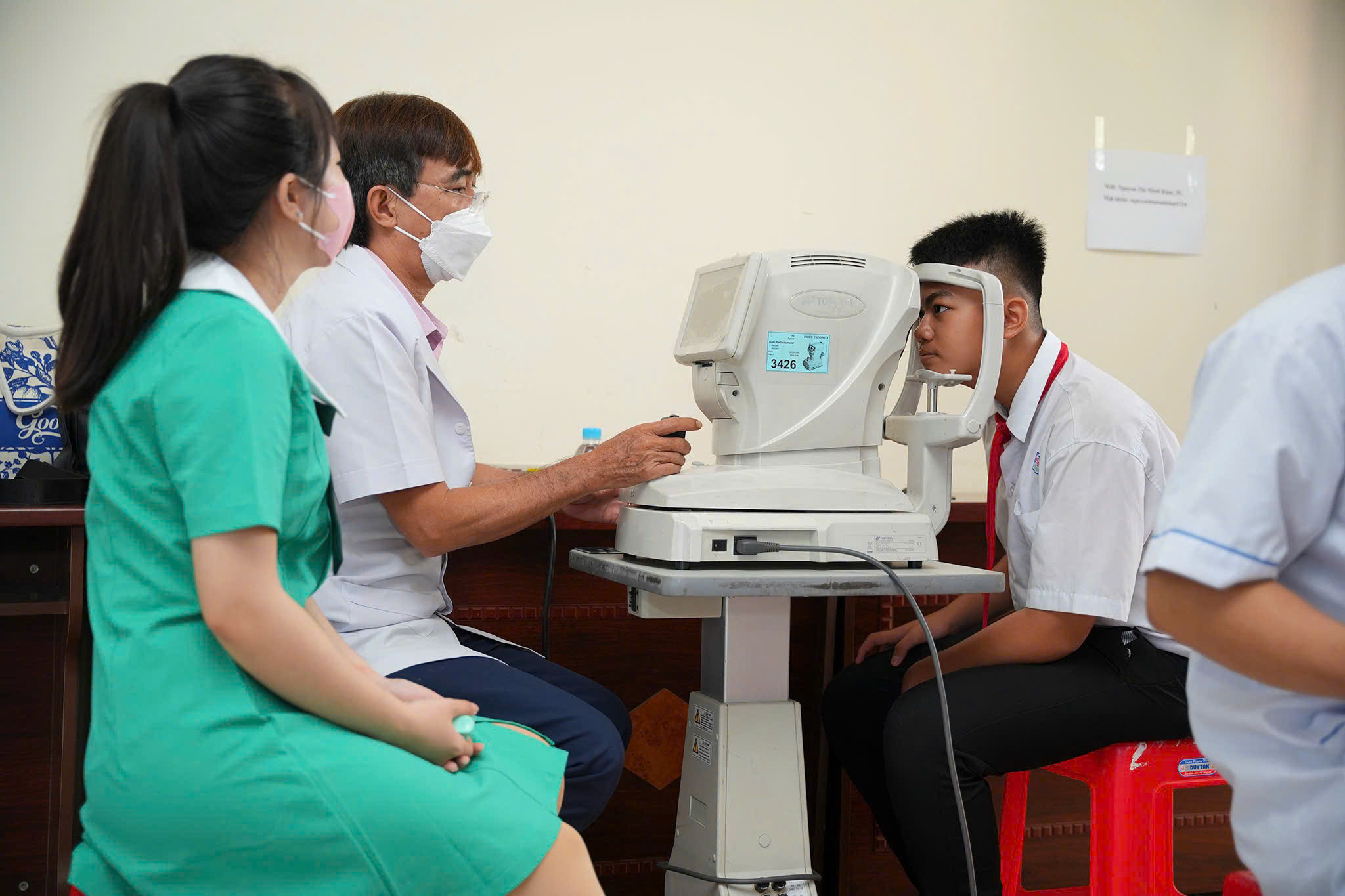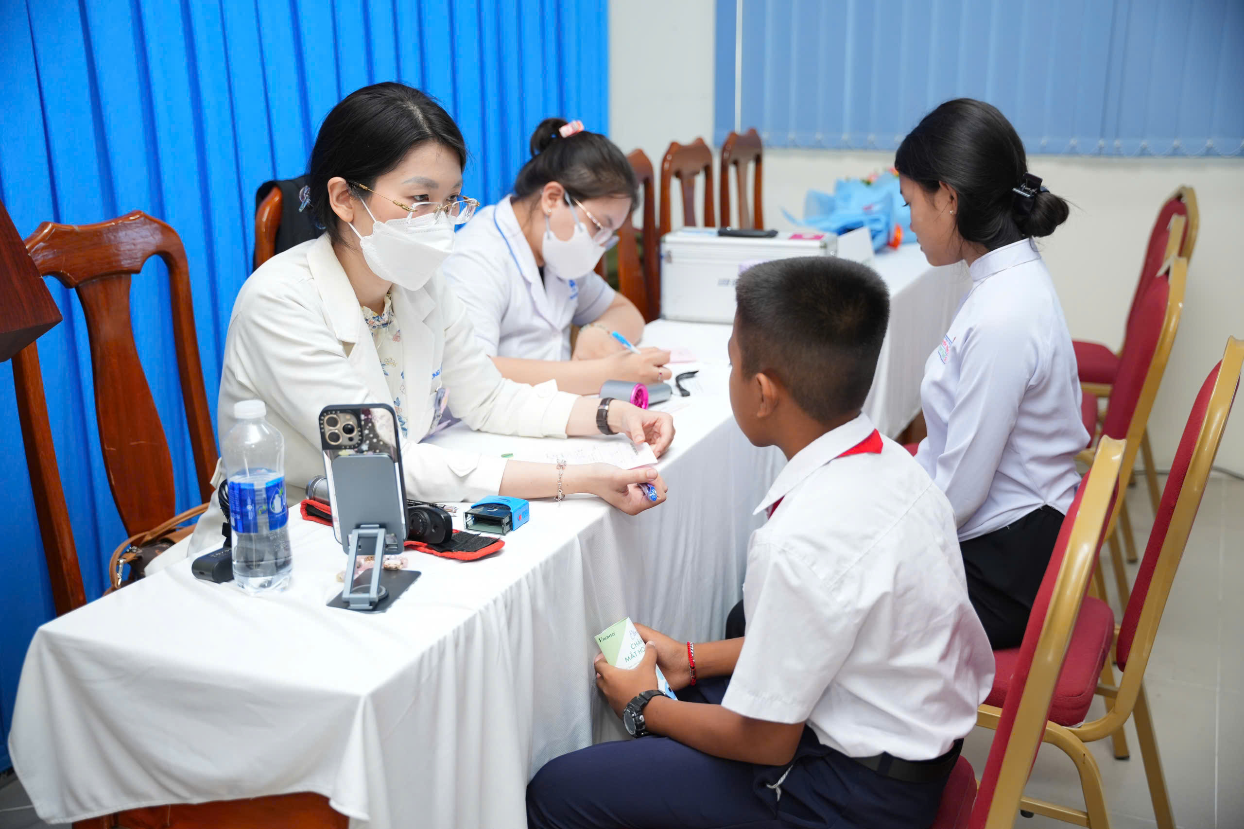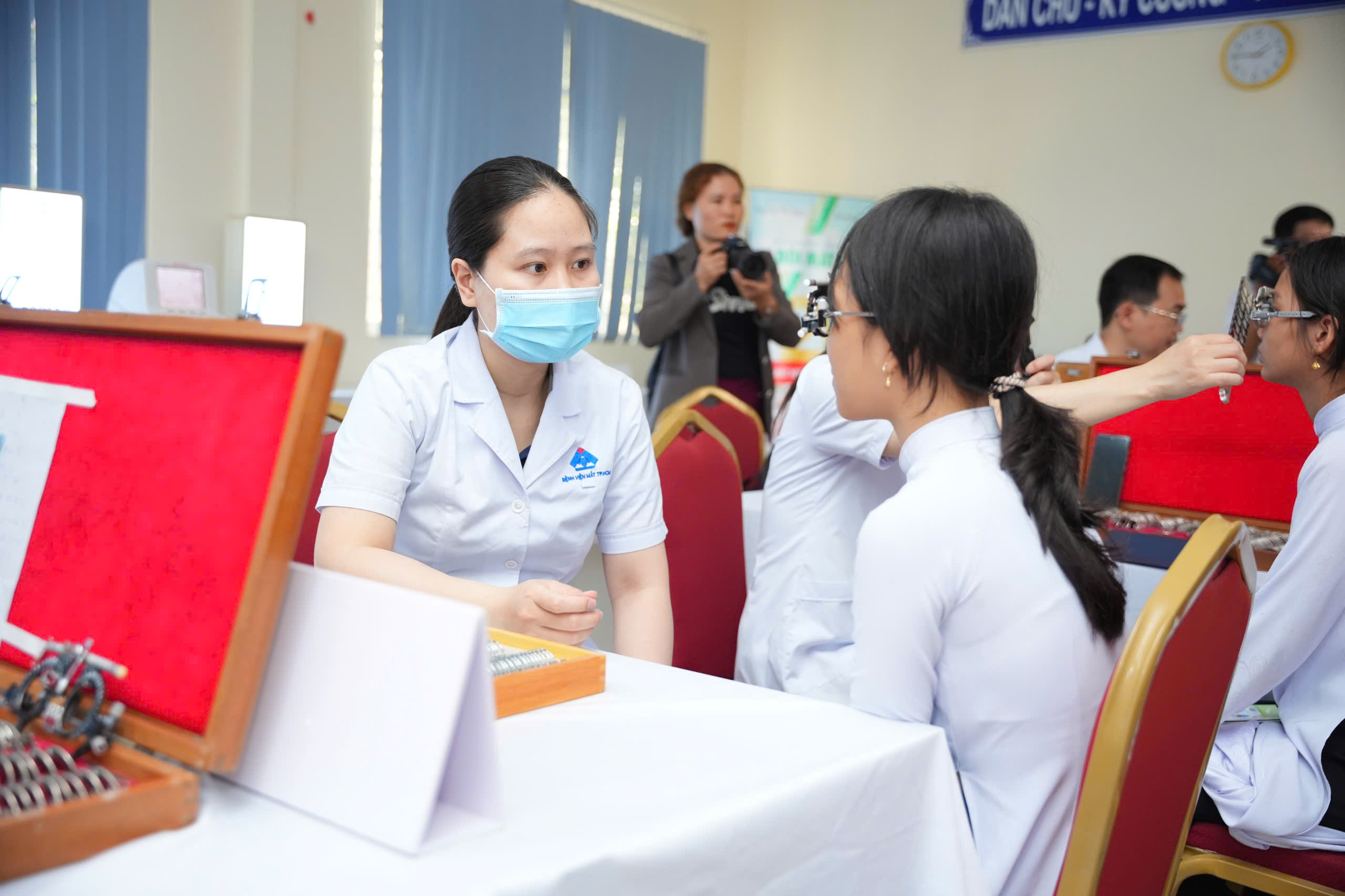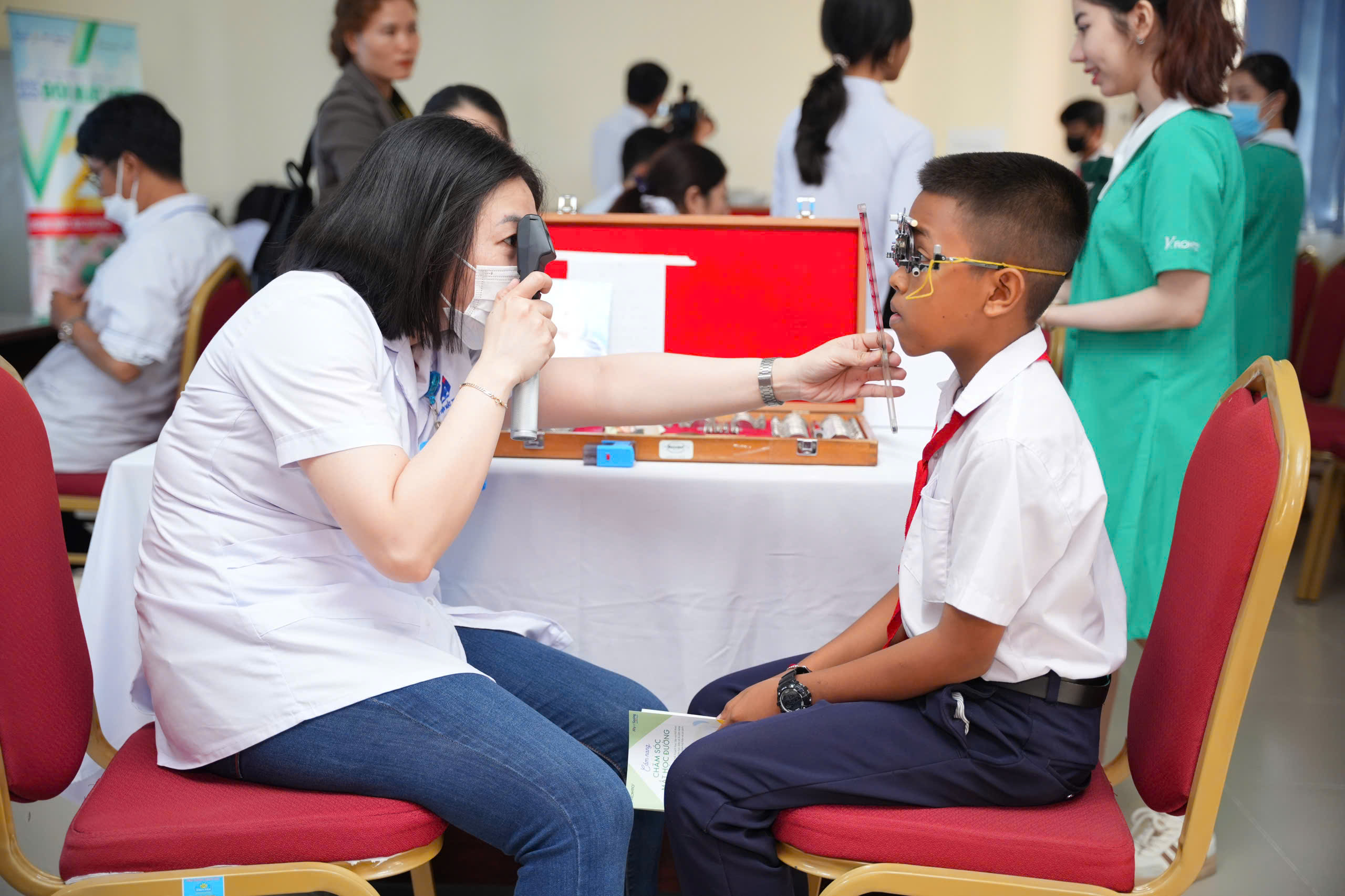 Tại các trường TH và THCS, học sinh được khám sàng lọc về mắt như: đo thị lực, khám mắt, đo khám khúc xạ và kê đơn kính, đơn thuốc cho học sinh có bệnh lý về mắt… đội ngũ bác sĩ, điều dưỡng chuyên khoa mắt hướng dẫn các bài tập vật lý trị liệu về mắt.